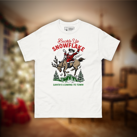 Buckle Up, Snowflake Mens christmas tee white